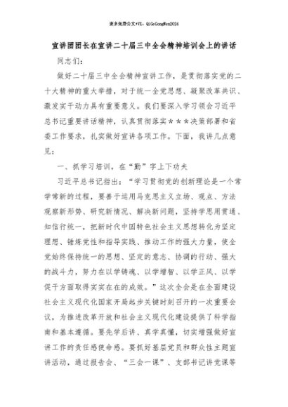 / 【七哥公文】2024年:宣讲团团长在宣讲二十届三中全会精神培训会上的讲话+更多免费公文+VX:QiGeGongWen2024