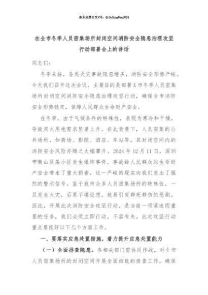 【七哥公文】2024年:在全市冬季人员密集场所封闭空间消防安全隐患治理攻坚行动部署会上的讲话+更多免费公文+VX:QiGeGongWen2024