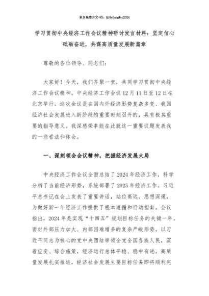 【七哥公文】2024年:学习贯彻中央经济工作会议精神研讨发言材料:坚定信心砥砺奋进,共谋高质量发展新篇章+更多免费公文+VX:QiGeGongWen2024