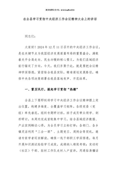 / 【七哥公文】2024年:在全县学习贯彻中央经济工作会议精神大会上的讲话+更多免费公文+VX:QiGeGongWen2024
