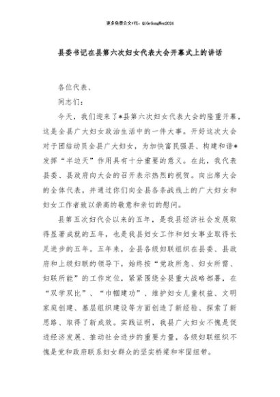 / 【七哥公文】2024年:县委书记在县第六次妇女代表大会开幕式上的讲话+更多免费公文+VX:QiGeGongWen2024