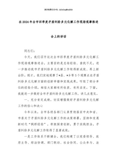 【七哥公文】2024年:在2024年全市四季度矛盾纠纷多元化解工作现场观摩推进会上的讲话+更多免费公文+VX:QiGeGongWen2024