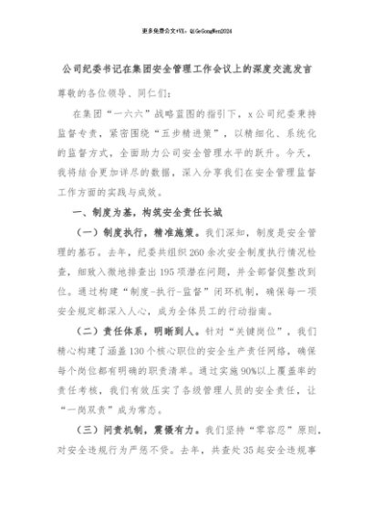 【七哥公文】2024年:公司纪委书记在集团安全管理工作会议上的深度交流发言+更多免费公文+VX:QiGeGongWen2024