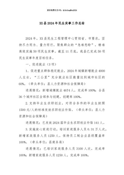 / 【七哥公文】2024年:XX县2024年民生实事工作总结+更多免费公文+VX:QiGeGongWen2024
