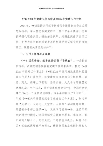 【七哥公文】2024年:乡镇2024年党建工作总结及2025年党建工作计划+更多免费公文+VX:QiGeGongWen2024
