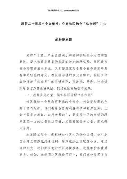 【七哥公文】2024年:践行二十届三中全会精神:化身社区融合“粘合剂”,共筑和谐家园+更多免费公文+VX:QiGeGongWen2024
