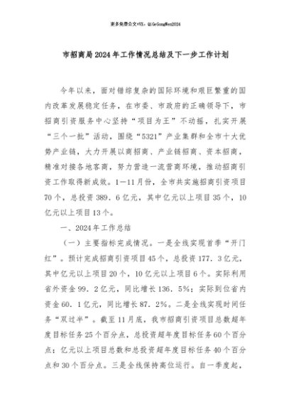 / 【七哥公文】2024年:市招商局2024年工作情况总结及下一步工作计划+更多免费公文+VX:QiGeGongWen2024