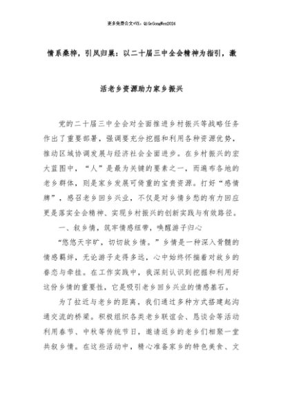 【七哥公文】2024年:情系桑梓,引凤归巢:以二十届三中全会精神为指引,激活老乡资源助力家乡振兴+更多免费公文+VX:QiGeGongWen2024