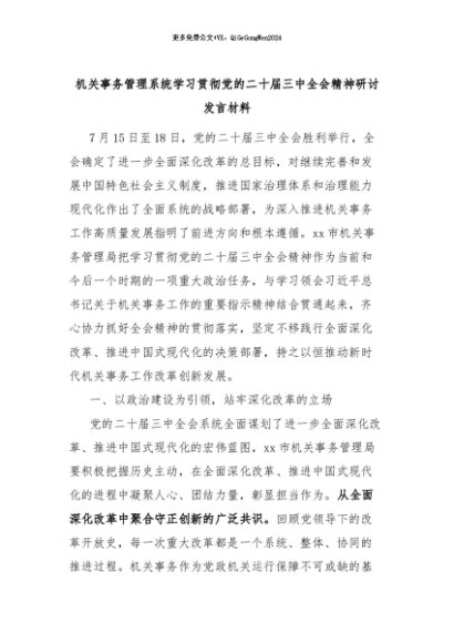 【七哥公文】2024年:机关事务管理系统学习贯彻党的二十届三中全会精神研讨发言材料+更多免费公文+VX:QiGeGongWen2024
