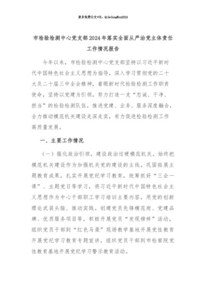 【七哥公文】2024年:市检验检测中心党支部2024年落实全面从严治党主体责任工作情况报告+更多免费公文+VX:QiGeGongWen2024