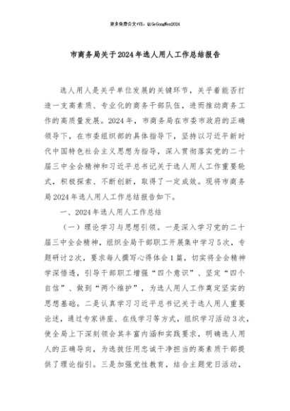 / 【七哥公文】2024年:市商务局关于2024年选人用人工作总结报告+更多免费公文+VX:QiGeGongWen2024