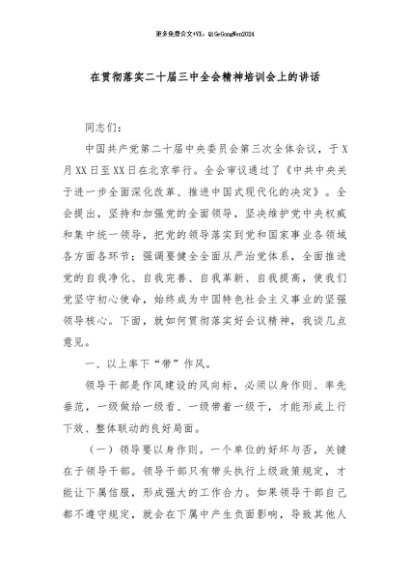/ 【七哥公文】2024年:在贯彻落实二十届三中全会精神培训会上的讲话+更多免费公文+VX:QiGeGongWen2024