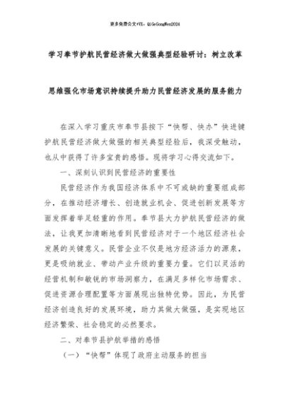 【七哥公文】2024年:学习奉节护航民营经济做大做强典型经验研讨:树立改革思维强化市场意识持续提升助力民营经济发展的服务能力+更多免费公文+VX:QiGeGongWen2024