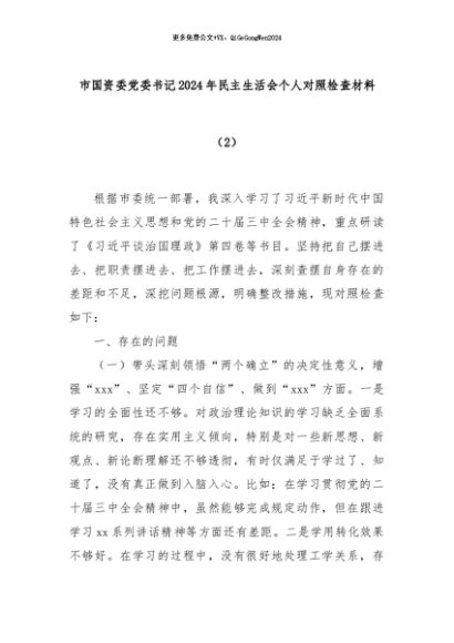 【七哥公文】2024年:市国资委党委书记2024年民主生活会个人对照检查材料(2)+更多免费公文+VX:QiGeGongWen2024