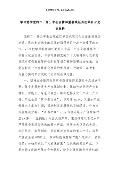 【七哥公文】2024年:学习贯彻党的二十届三中全会精神暨县域经济改革研讨发言材料+更多免费公文+VX:QiGeGongWen2024