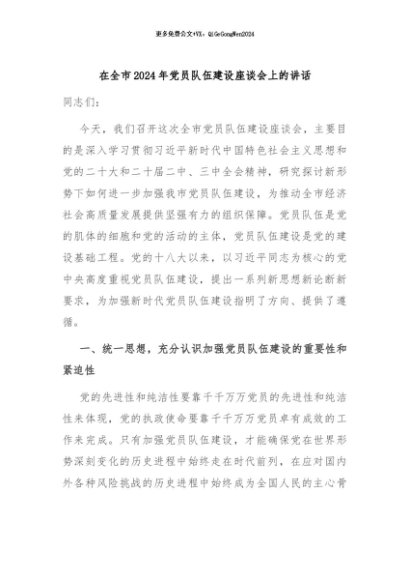 / 【七哥公文】2024年:在全市2024年党员队伍建设座谈会上的讲话+更多免费公文+VX:QiGeGongWen2024