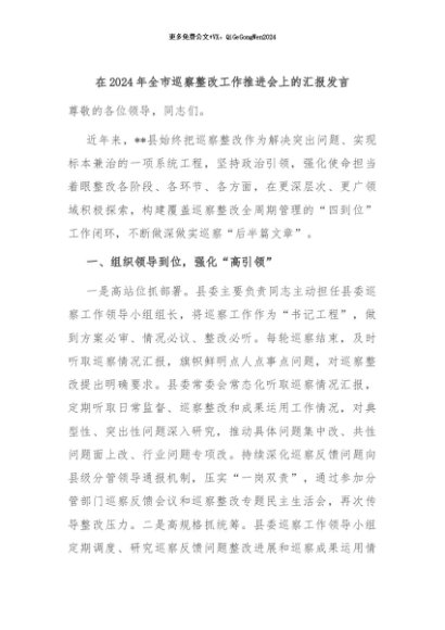 / 【七哥公文】2024年:在2024年_全市巡察整改工作推进会上的汇报发言+更多免费公文+VX:QiGeGongWen2024