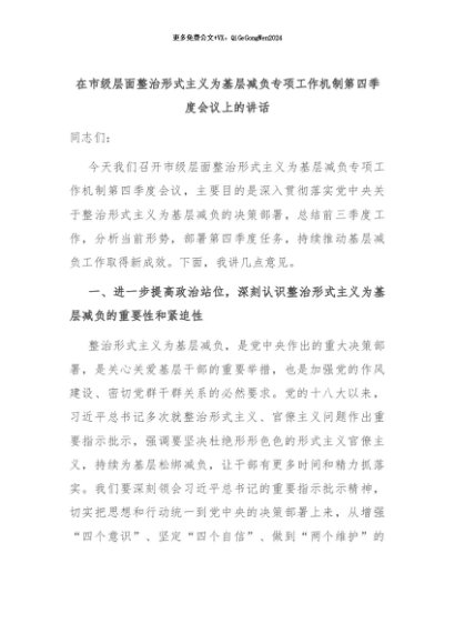 【七哥公文】2024年:在市级层面整治形式主义为基层减负专项工作机制第四季度会议上的讲话+更多免费公文+VX:QiGeGongWen2024