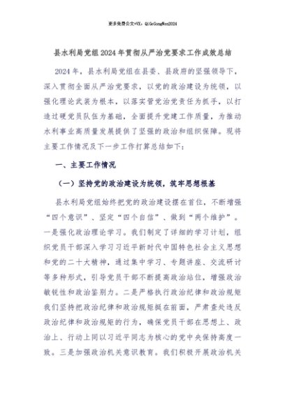 【七哥公文】2024年:县水利局党组2024年贯彻从严治党要求工作成效总结+更多免费公文+VX:QiGeGongWen2024