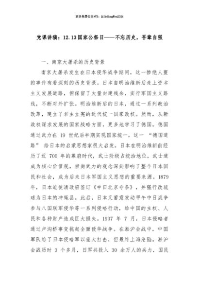 【七哥公文】2024年:国家公祭日爱国教育党课讲稿:纪念南京大屠杀——不忘历史,吾辈自强+更多免费公文+VX:QiGeGongWen2024