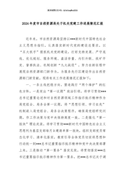 【七哥公文】2024年:2024年度市自然资源局关于机关党建工作进展情况汇报+更多免费公文+VX:QiGeGongWen2024