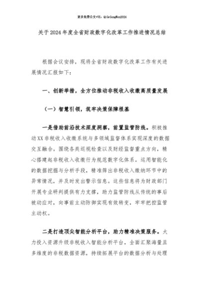 【七哥公文】2024年:关于2024年度全省财政数字化改革工作推进情况总结+更多免费公文+VX:QiGeGongWen2024