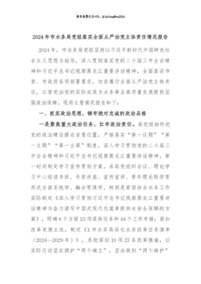 【七哥公文】2024年:2024年市水务局党组落实全面从严治党主体责任情况报告+更多免费公文+VX:QiGeGongWen2024