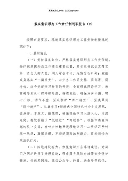 / 【七哥公文】2024年:落实意识形态工作责任制述职报告(2)+更多免费公文+VX:QiGeGongWen2024