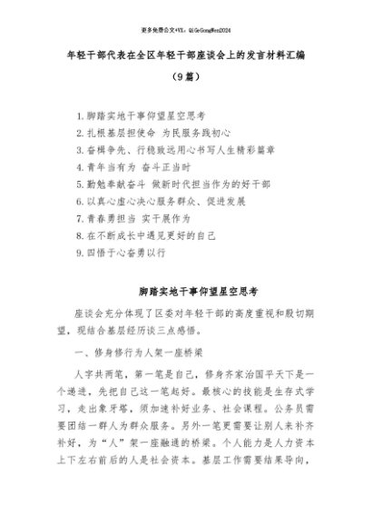 【七哥公文】2024年:(9篇)年轻干部代表在全区年轻干部座谈会上的发言材料汇编+更多免费公文+VX:QiGeGongWen2024