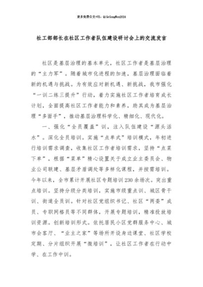/ 【七哥公文】2024年:社工部部长在社区工作者队伍建设研讨会上的交流发言+更多免费公文+VX:QiGeGongWen2024