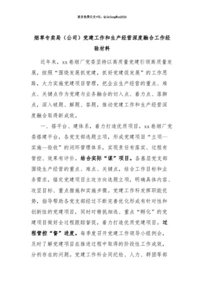 【七哥公文】2024年:烟草专卖局(公司)党建工作和生产经营深度融合工作经验材料+更多免费公文+VX:QiGeGongWen2024