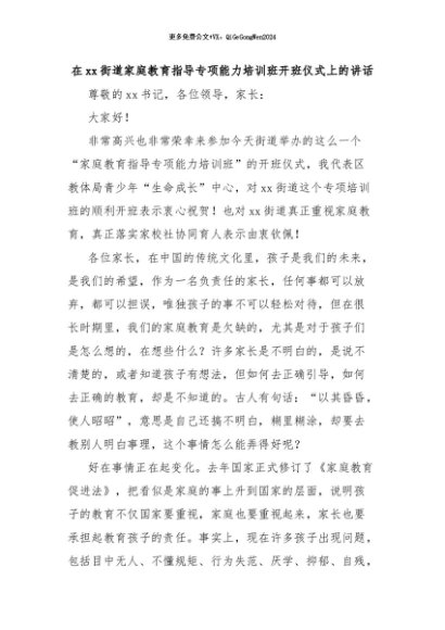 【七哥公文】2024年:在xx街道家庭教育指导专项能力培训班开班仪式上的讲话+更多免费公文+VX:QiGeGongWen2024