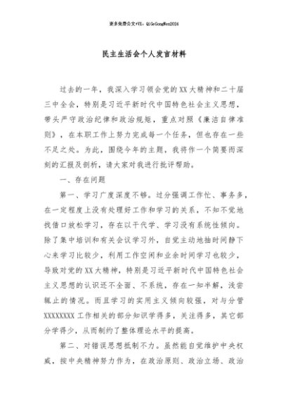 / 【七哥公文】2024年:民主生活会个人发言材料+更多免费公文+VX:QiGeGongWen2024