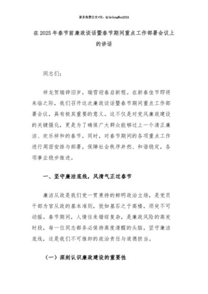 【七哥公文】2024年:在2025年春节前廉政谈话暨春节期间重点工作部署会议上的讲话+更多免费公文+VX:QiGeGongWen2024