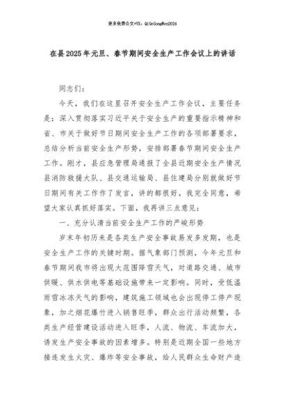 【七哥公文】2024年:在县2025年元旦、春节期间安全生产工作会议上的讲话+更多免费公文+VX:QiGeGongWen2024