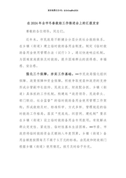 / 【七哥公文】2024年:在2024年全市冬春救助工作推进会上的汇报发言+更多免费公文+VX:QiGeGongWen2024