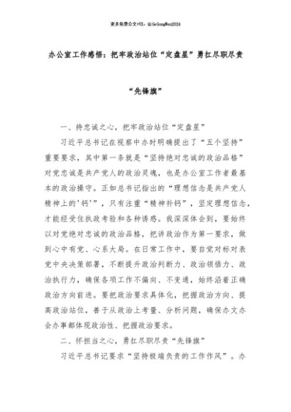 【七哥公文】2024年:办公室工作感悟:把牢政治站位“定盘星”勇扛尽职尽责“先锋旗”+更多免费公文+VX:QiGeGongWen2024