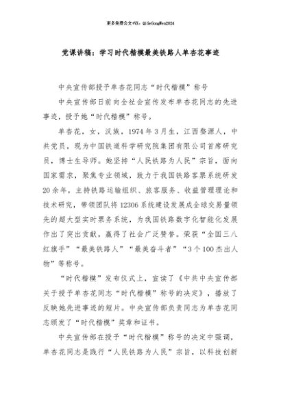 【七哥公文】2024年:党课讲稿:最美铁路人单杏花事迹+更多免费公文+VX:QiGeGongWen2024