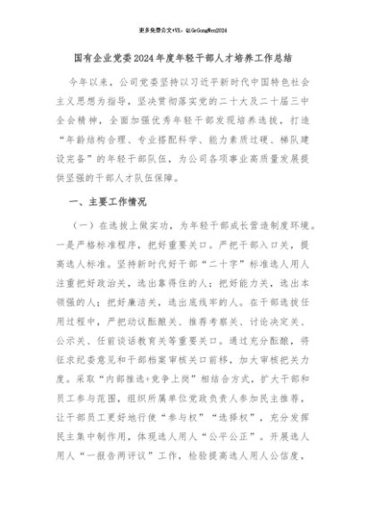/ 【七哥公文】2024年:国有企业党委2024年度年轻干部人才培养工作总结+更多免费公文+VX:QiGeGongWen2024