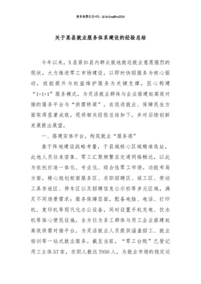 / 【七哥公文】2024年:关于某县就业服务体系建设的经验总结+更多免费公文+VX:QiGeGongWen2024