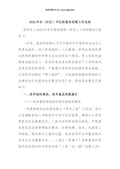 / 【七哥公文】2024年:2024年村(社区)书记抓基层党建工作总结+更多免费公文+VX:QiGeGongWen2024