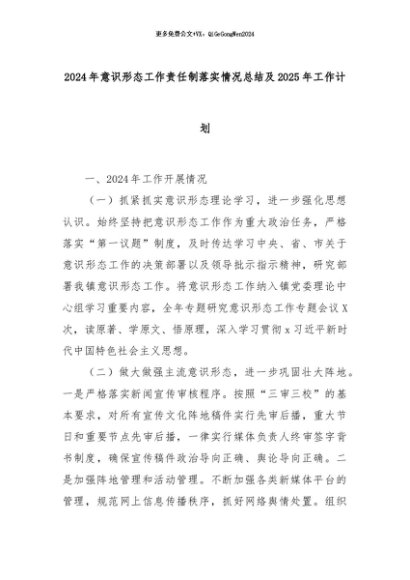 【七哥公文】2024年:2024年意识形态工作责任制落实情况总结及2025年工作计划+更多免费公文+VX:QiGeGongWen2024
