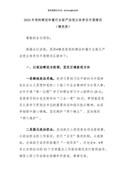 【七哥公文】2024年:2024年党的建设和履行全面严治党主体责任开展情况(镇党委)+更多免费公文+VX:QiGeGongWen2024