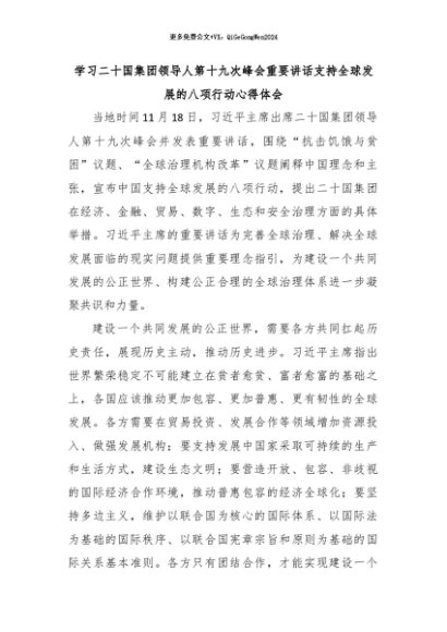 【七哥公文】2024年:学习二十国集团领导人第十九次峰会重要讲话支持全球发展的八项行动心得体会+更多免费公文+VX:QiGeGongWen2024
