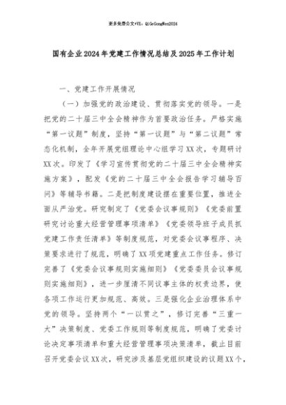 【七哥公文】2024年:国有企业2024年党建工作情况总结及2025年工作计划 (1)+更多免费公文+VX:QiGeGongWen2024