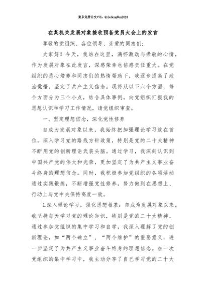 / 【七哥公文】2024年:在某机关发展对象接收预备党员大会上的发言+更多免费公文+VX:QiGeGongWen2024