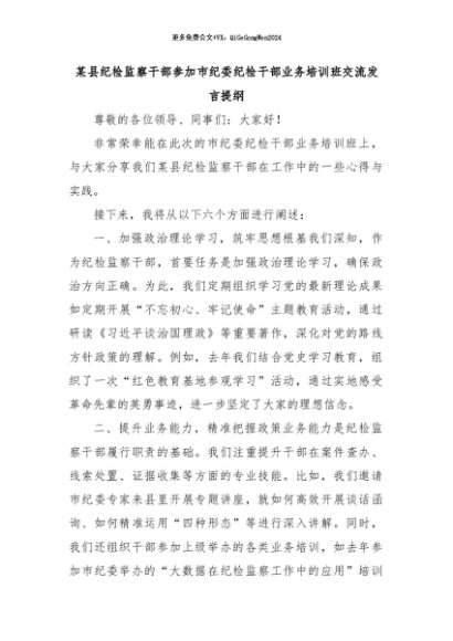 【七哥公文】2024年:某县纪检监察干部参加市纪委纪检干部业务培训班交流发言提纲+更多免费公文+VX:QiGeGongWen2024