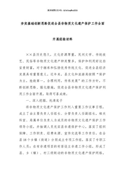 【七哥公文】2024年:夯实基础创新思路促进全县非物质文化遗产保护工作全面开展经验材料+更多免费公文+VX:QiGeGongWen2024