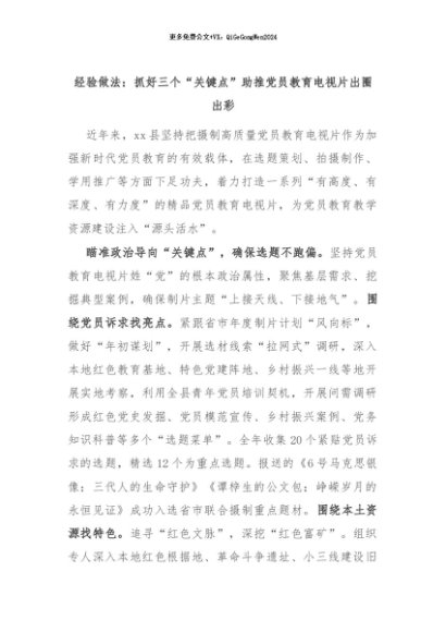 【七哥公文】2024年:经验做法:抓好三个“关键点”助推党员教育电视片出圈出彩+更多免费公文+VX:QiGeGongWen2024