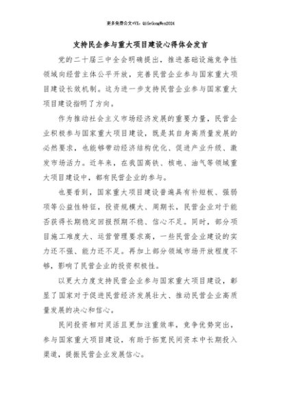 / 【七哥公文】2024年:支持民企参与重大项目建设心得体会发言+更多免费公文+VX:QiGeGongWen2024